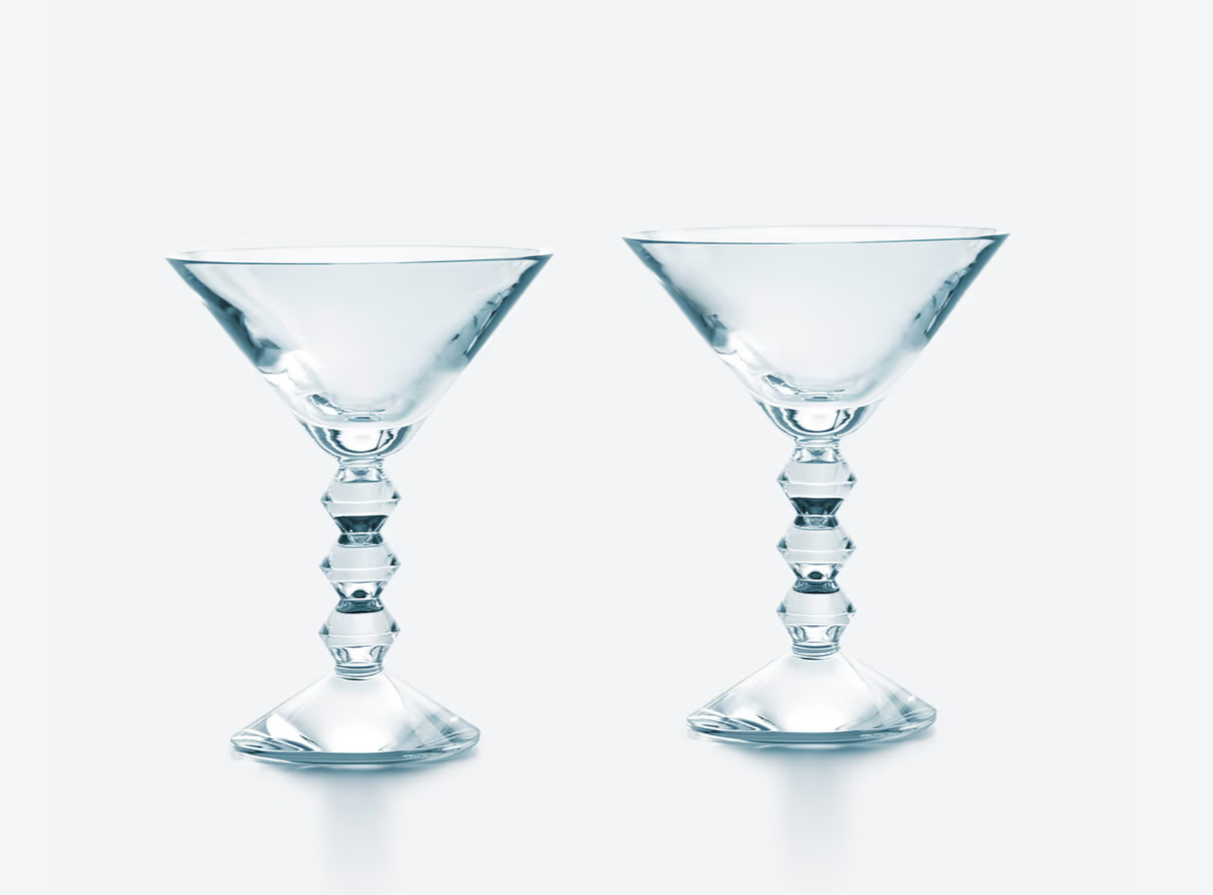 The perfect glass set for the perfect dry martinis at home. Invite your friends and enjoy! The geometric stem is eye-catching, a stack of three diabolo shaped Baccarat crystal pieces resembling exquisite beads strung together or Brancusi's geometric totems. Iconic lineage.