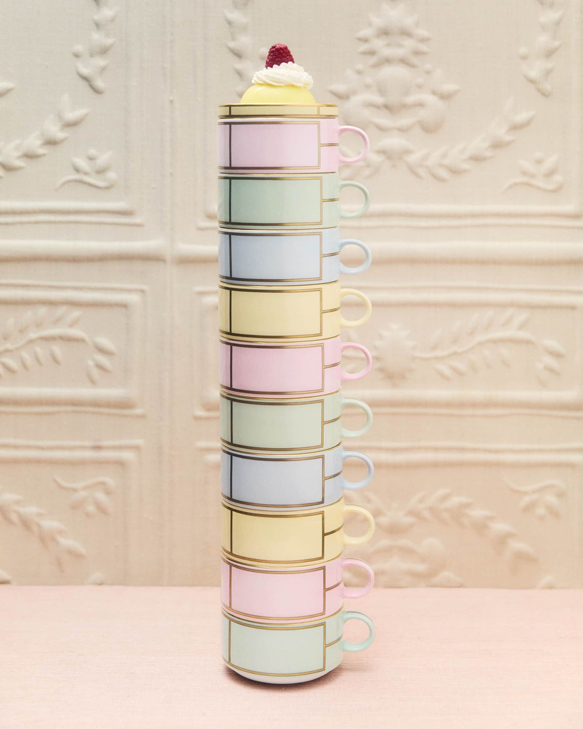 The complete set consists of two cups and two saucers in porcelain with a decorative motif and exquisite gold threading. The Colonna shape, GiovanniGariboldi's icon of functionality first released in the mid-20th century andawarded the prestigious Compasso d'Oro in 1954, characterizes its sleek, lineardesign. It completes the tea service alongside the sugar bowl, teapot and milkpitcher, all of which are designed to be coordinated with elements in each ofthe four pastel colors available. It comes wrapped in an exclusive luxury box,making it the perfect gift. Diva is a collection of tableware and giftware thatcaptures the vibrant energy of mid-century Italy and the glamour of the greatdivas who star in the history of 1950s cinema.