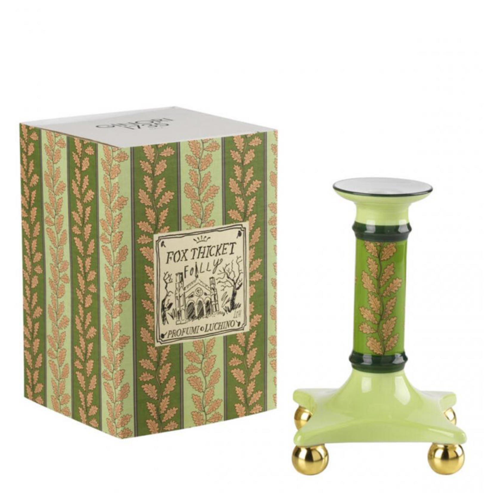 Artist and designer Luke Edward Hall shares his journey around the world, describing the places dear to his heart that have marked him. With Fox Thicket Folly, he lands in England, one of the most important destinations, where the artist was born and raised. It is in a gothic mansion in the Cotswolds, where one can only read by candlelight, that the candleholder was last seen. Right there, atop a pile of aged books, from which the precious piece of art decorated with oak leaves is breached. It pairs with the Fox Thicket Folly candle, with woody and smoky notes, available separately. Profumi Luchino is a home fragrance collection of five fragrances that are accompanied by Profumi Luchino, real pieces of art whose decorations are inspired by the five places dearest to the artist, in an interweaving of reality and fantasy.