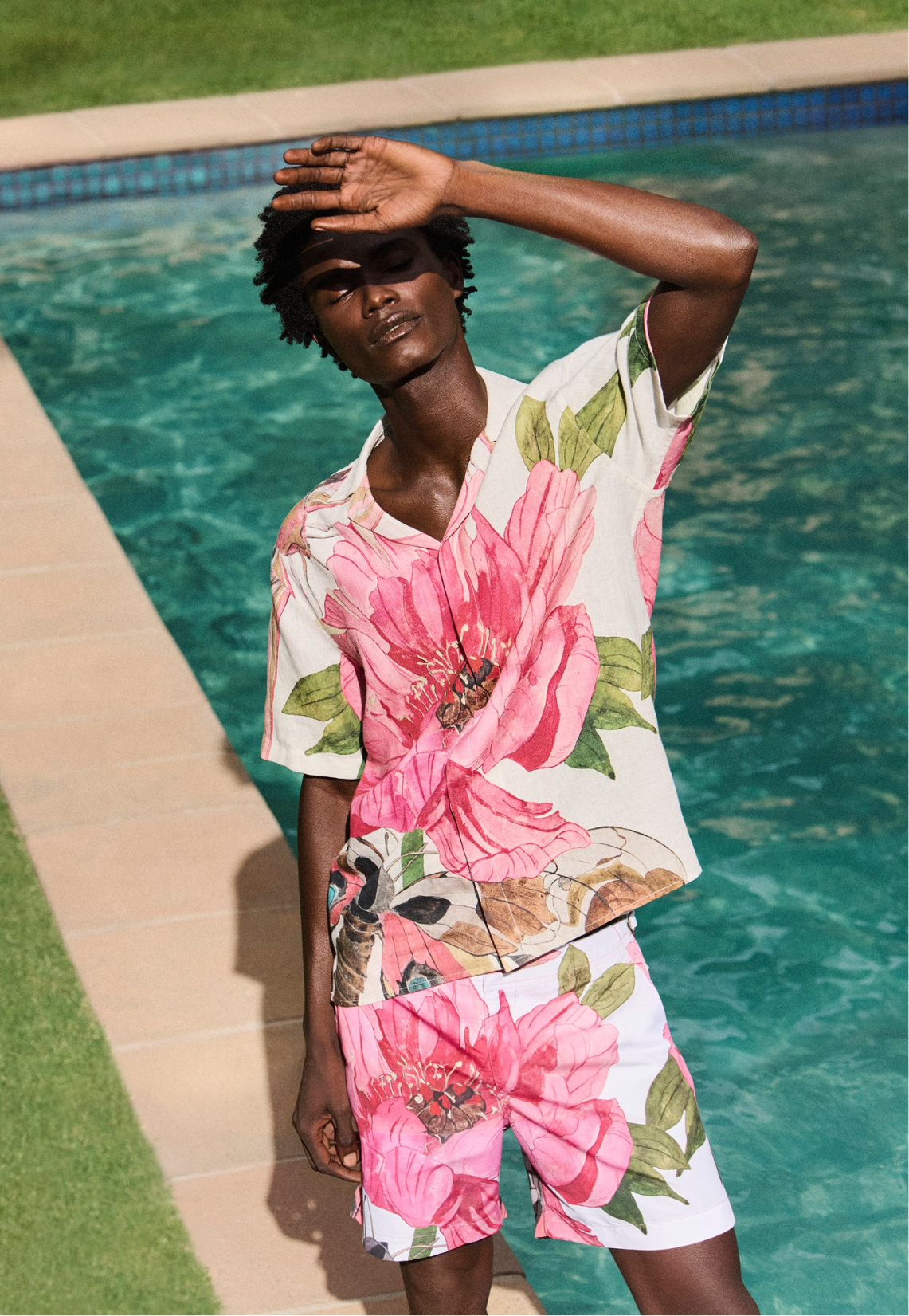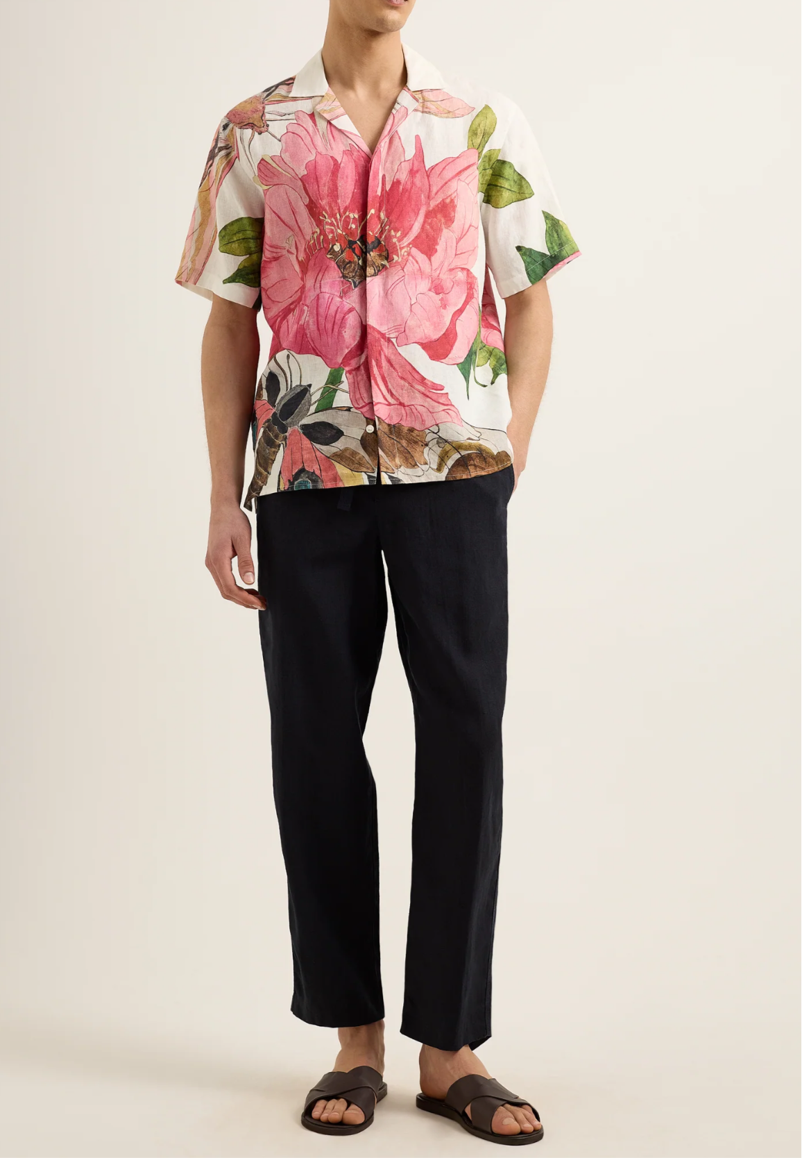 He taps the arm of his lounge chair, fingers drumming the improvised melody of a soul finally released from daily cares. The Maitan moves with effortless ease - lightweight, woven with the bold sweep of the Paeonia print, a hint of playfulness beneath clean precision. The Capri collar rests just open enough, the concealed placket keeping its refinement intact. A shirt made for slipping between worlds, for moments that feel like déjà vu.