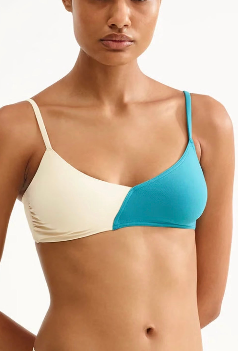 Featuring a two-tone crossover design with a layered effect and a delicate gathered neckline, the Dualité triangle bikini top flatters all body shapes with its graphic allure. Its thin straps and side boning add a touch of elegance and femininity.