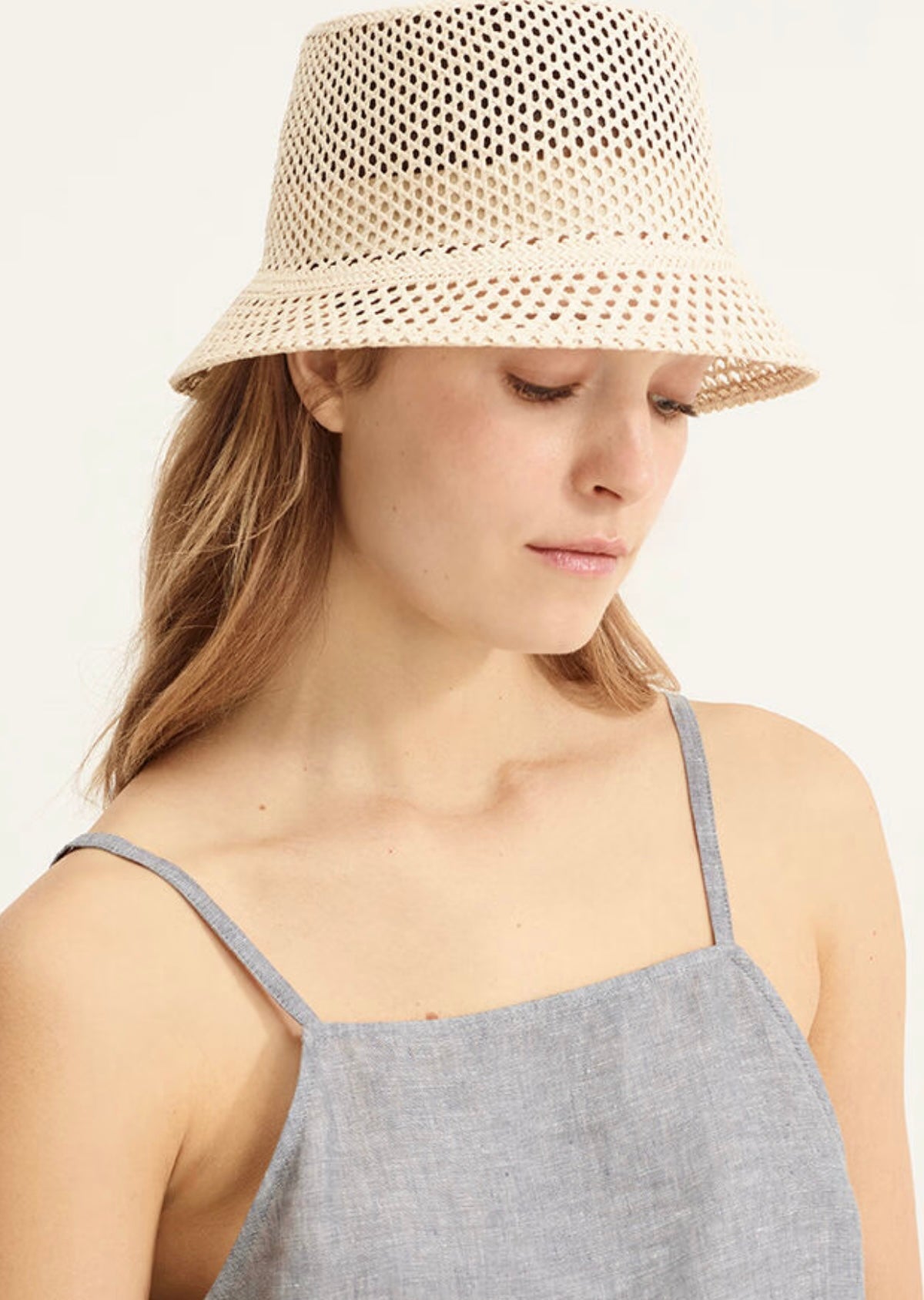 Palmyre, a sun hat in openwork paper straw, features a distinctive lightness and summer allure. The perfect finishing piece for a solar silhouette, it offers understated and contemporary protection.