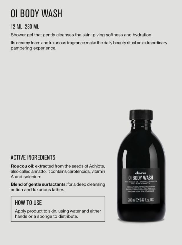 For all skin types. Moisturizing and softening, OI Body Wash has a creamy texture that leaves all skin types feeling soft and silky.